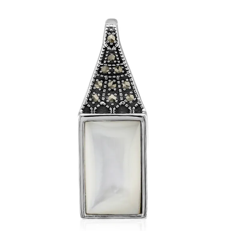 Entdecken Sie die Eleganz dieses atemberaubenden Anhängers mit einem schlanken, baguettförmigen chinesischen Perlmutt inmitten einer glitzernden Umrahmung aus 10 rumänischen Markasitsteinen. Gefertigt aus 925er Sterlingsilber und mit einem Gesamtgewicht von 1,9 Gramm hängt dieser Anhänger elegant an jeder Kette. Er eignet sich perfekt, um Ihrer Abendgarderobe einen Hauch von Raffinesse zu verleihen oder einen lässigen Tageslook mit seinem zeitlosen Charme aufzuwerten.