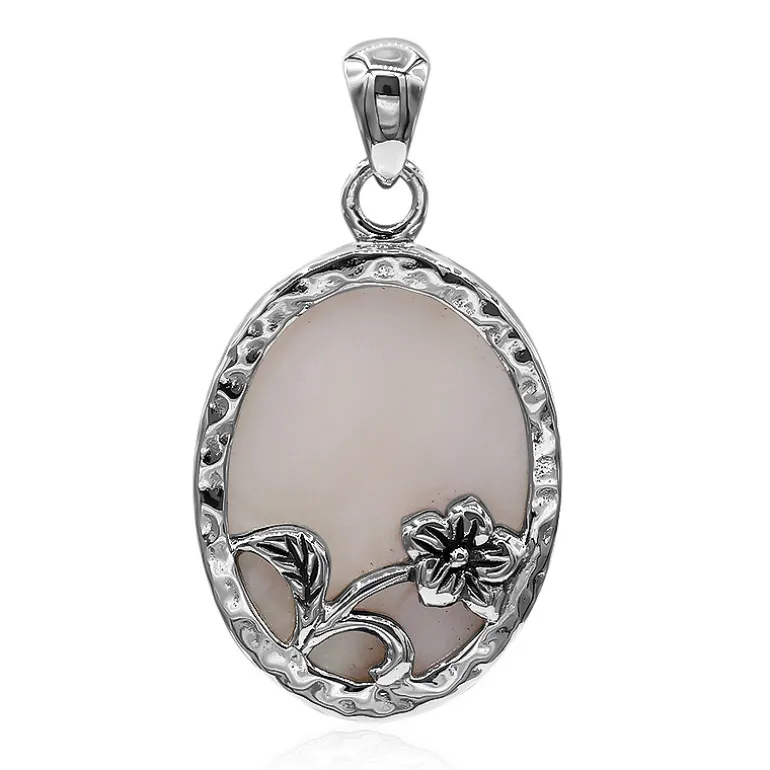 Entdecken Sie die Anziehungskraft dieses aufwendig gearbeiteten Anhängers mit einem leuchtenden ovalen chinesischen Perlmutt, eingefasst in feines 925er Sterling Silber. Mit seinen eleganten Maßen von 34×18 mm zeigt dieser Anhänger anmutige, von der Natur inspirierte Blumenmotive, die seinen raffinierten Reiz unterstreichen. Er ist perfekt geeignet, um sowohl der Tages- als auch der Abendgarderobe einen Hauch von Eleganz zu verleihen und verspricht eine vielseitige Ergänzung jeder Schmucksammlung zu sein.