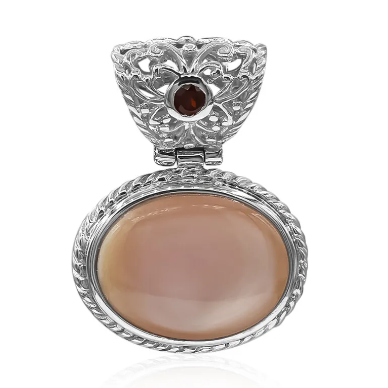 Entdecken Sie die natürliche Schönheit dieses charmanten Anhängers aus chinesischem Perlmutt, der mit einem zierlichen Granat aus Mosambik (0,085 ct) verziert ist. Das komplizierte Design mit einem ovalen Perlmutt von 16×12,5 mm und einer Basis aus Sterlingsilber von ca. 3,23 g ist ein Beispiel für Handwerkskunst. Dieser Anhänger mit den Maßen 27×20 mm ist ein vielseitiges Schmuckstück, das jedes Outfit aufwerten kann, von leger bis formell. Seine zeitlose Eleganz macht ihn zu einer exquisiten Ergänzung jeder Schmucksammlung und zu einem durchdachten Geschenk für einen besonderen Menschen.