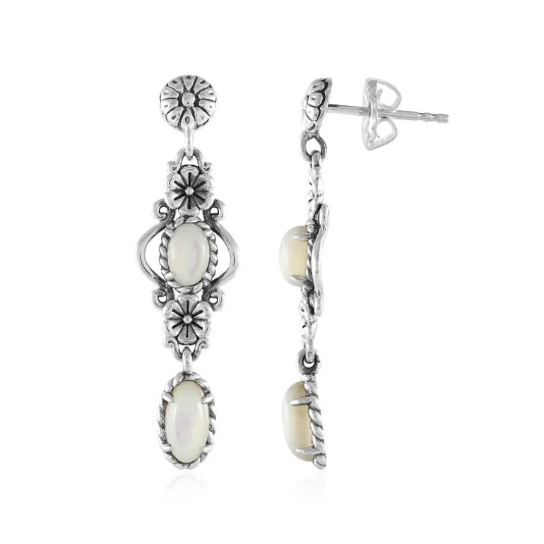 Umarmen Sie die Eleganz mit diesen atemberaubenden Sterling Silber Ohrringen mit ovalen Perlmutt Edelsteinen aus China. Mit einem Gewicht von 3,3 g und einer Größe von 37 mm bieten diese Ohrringe einen raffinierten „Desert Chic“ Stil mit floralen Akzenten. Sie sind ideal, um sowohl legere als auch formelle Outfits aufzuwerten und sind das perfekte Accessoire für Hochzeiten, Abendessen oder einen einfachen Tagesausflug.