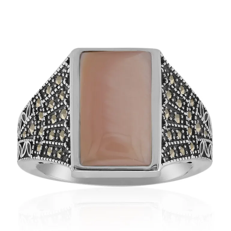 Tauchen Sie ein in die weiche, leuchtende Umarmung dieses chinesischen Perlmuttrings. Dieser Ring aus 925er Sterlingsilber mit Perlmutt im Baguetteschliff, das von 32 funkelnden Markasiten aus Rumänien umrahmt wird, ist ein Beweis für schicke Eleganz. Mit einem Gewicht von ca. 3,7 g und einer Größe von 24 x 20 mm vermittelt das Design mühelos Raffinesse. Dieses vielseitige Schmuckstück ist sowohl für den Tag als auch für den Abend geeignet und passt zu einer Vielzahl von Outfits, was es zu einer unverzichtbaren Ergänzung jeder Schmucksammlung macht.