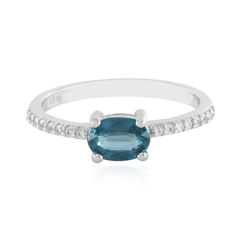 Dieser schicke Ring zeigt einen schillernden indischen Petrol-Kyanit mit einem Gewicht von 0,829 ct. im Ovalschliff, der seine atemberaubenden blauen Farbtöne noch verstärkt. Ergänzt wird er durch 16 funkelnde kambodschanische Zirkone im Rundschliff mit einem Gesamtgewicht von 0,235 ct, die entlang des Rings gefasst sind. Gefertigt aus 925er Sterlingsilber mit einer Platinbeschichtung für zusätzlichen Glanz und einem Gewicht von ca. 1,67 g. Perfekt für einen Hauch von Alltags-Eleganz oder als fesselndes Statement-Stück für besondere Anlässe.