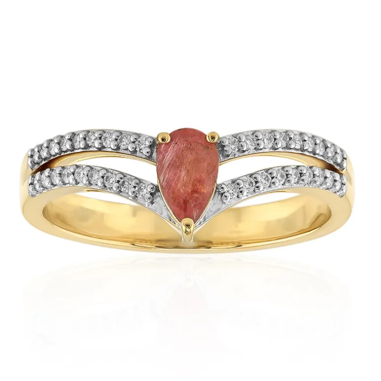 Entdecken Sie die Faszination dieses Rings aus 18 Karat Gelbgold, der einen seltenen, tropfenförmigen Pezzottait aus Madagaskar von 0,29 Karat präsentiert. Der einzigartige rosafarbene Farbton dieses Edelsteins wird elegant von einem doppelten Band eingerahmt, das mit 36 funkelnden SI2-Diamanten von insgesamt 0,101 Karat besetzt ist. Das Gesamtgewicht von 0,391 Karat verbindet sich mit der Wärme des hochwertigen Goldes zu einem ebenso auffälligen wie raffinierten Schmuckstück. Perfekt für besondere Anlässe oder zur Aufwertung Ihres Alltagsstils.