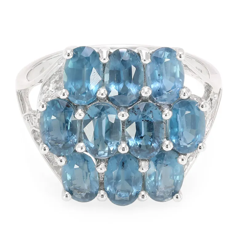 Entdecken Sie die luxuriöse Anziehungskraft dieses atemberaubenden Silberrings, der mit 10 oval geschliffenen indischen Peacock-Kyaniten von insgesamt 5,5 Karat besticht. Zwischen den auffallend blauen Edelsteinen sind 8 funkelnde weiße Topase aus Brasilien eingebettet, von denen jeder sorgfältig geschliffen wurde, um die Brillanz zu maximieren. Gefertigt aus hochwertigem 925er Sterlingsilber mit einem Gewicht von ca. 2,73 g, verspricht dieses exquisite Stück Langlebigkeit und Glanz. Das elegante Design macht ihn zur idealen Wahl für Ihre Abendgarderobe oder als glamourösen Akzent für Ihr tägliches Outfit, damit Sie bei jeder Gelegenheit glänzen.