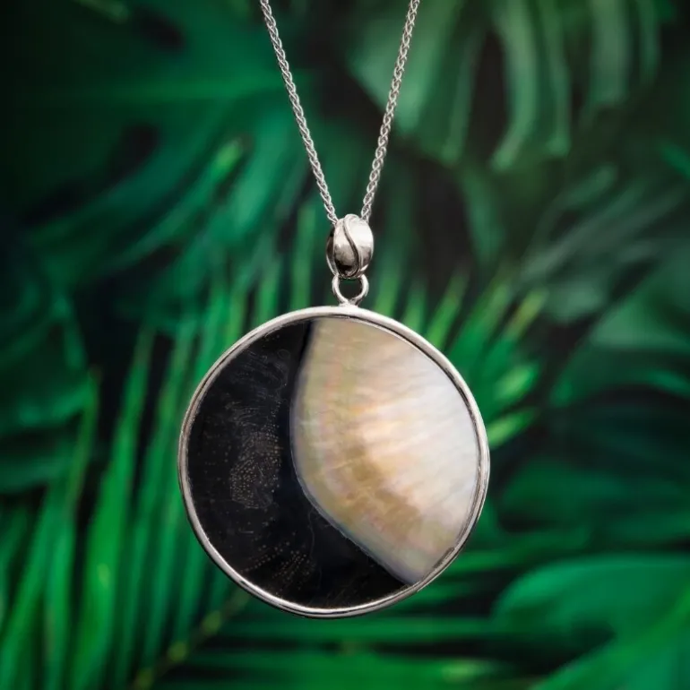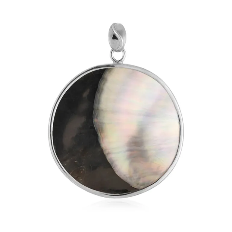 Entdecken Sie die himmlische Schönheit des indonesischen Pinctada-Perlmutts, das meisterhaft in einen Anhänger aus 925er Sterlingsilber mit Platin-Finish eingefasst ist. Dieser runde, 41 mm große Anhänger reflektiert ein schillerndes Farbspektrum, wobei jeder Winkel eine neue Nuance offenbart. Der Anhänger misst 54 x 42 mm und ist damit ein auffälliges und zugleich elegantes Schmuckstück. Er ist ein ideales Accessoire, um jedem Outfit einen Hauch von Raffinesse zu verleihen, oder ein unvergessliches Geschenk für einen besonderen Menschen. Kombinieren Sie es mit einem schwarzen Abendkleid oder einer weißen Bluse für einen Look, der garantiert alle Blicke auf sich zieht.