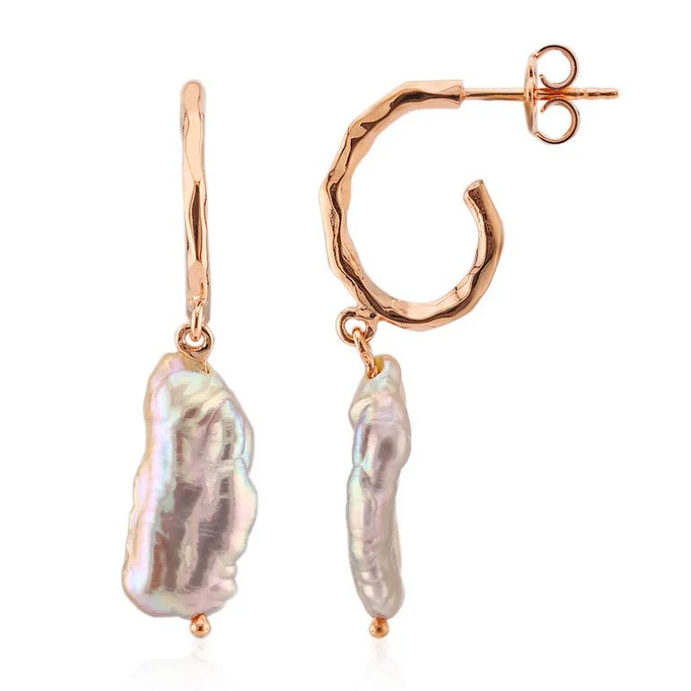Entdecken Sie die Anziehungskraft der Raffinesse mit diesen schicken rosa Süßwasserperlen-Ohrringen. Die natürliche Form jeder Perle im einzigartigen Tropfen-Stil spiegelt ein elegantes Schillern wider, das durch den warmen Glanz der roséfarbenen Silberringe ergänzt wird. Mit einer Größe von mindestens 43 mm sind diese Ohrringe vielseitig einsetzbar, sowohl für den Tag als auch für den Abend, und verleihen jedem Outfit einen Hauch von Anmut. Perfekt für alle, die die Schönheit natürlicher Edelsteine mit einem modernen Touch zu schätzen wissen.