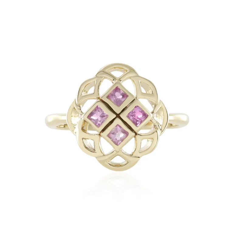 Entdecken Sie die Faszination dieses Rings aus 9-karätigem Gelbgold mit vier rosafarbenen Ceylon-Saphiren im quadratischen Prinzess-Schliff von insgesamt 0,304 Karat. Mit seinem durchbrochenen Design bringt der Ring die zarten rosa Farbtöne der Edelsteine auf raffinierte Weise zur Geltung. Die Saphire, die aus den renommierten Lagerstätten Sri Lankas stammen, sind sorgfältig in einem harmonischen Muster gefasst und machen dieses Schmuckstück zu einem echten Hingucker. Dieses Schmuckstück eignet sich sowohl für einen legeren Brunch als auch für elegante Abende und ergänzt jede Garderobe mit seinem zeitlosen Charme und einem Hauch von Farbe.