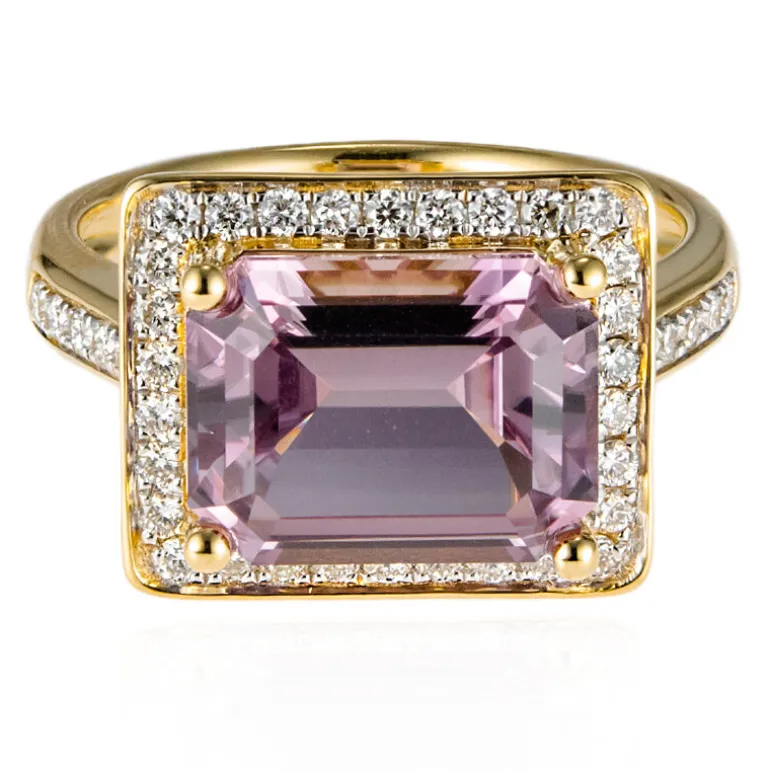 Dieser atemberaubende Ring aus 18 Karat Gelbgold präsentiert einen faszinierenden 4,203 ct. rosafarbenen Diaspore aus Afghanistan, der in einem achteckigen Stufendesign perfekt geschliffen ist. Er wird von einem Halo aus 40 funkelnden Diamanten in Reinheit SI2 mit einem Gesamtgewicht von 0,36 ct umrahmt, die den verführerischen Farbton des Edelsteins noch stärker betonen. Mit einem Gewicht von ca. 5,78 g ist dieser Ring von AMAYANI nicht nur von konventioneller Schönheit, sondern verleiht jedem Outfit einen raffinierten Touch. Ideal für feierliche Anlässe oder einfach, um Ihrem Alltagsoutfit einen Hauch von Eleganz zu verleihen.