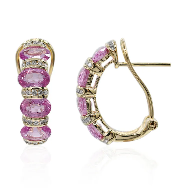 Wir präsentieren ein exquisites Paar goldener Ohrringe mit leuchtenden rosa Saphiren aus Madagaskar und funkelnden Diamanten. Diese Ohrringe aus 14-karätigem Gelbgold bestechen durch Saphire im Ovalschliff und runde Brillanten. Perfekt für elegante Abende oder als luxuriöses Accessoire für den Alltag. Kombinieren Sie sie mit einem eleganten Kleid oder einer schicken Bluse für einen atemberaubenden Look.