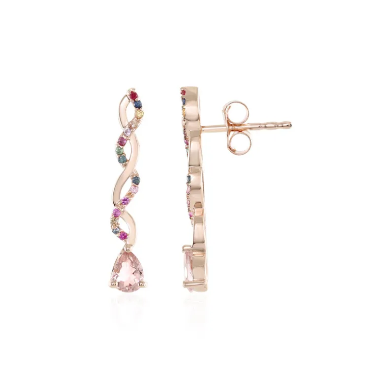 Diese anmutig gestalteten Ohrringe zeigen rosafarbene Turmaline aus Madagaskar im Tränenschliff, die zart an einer Wellenlinie aus lebhaften Saphiren hängen. Sie sind aus 925er Sterlingsilber mit einer romantischen Roségoldplattierung gefertigt und haben ein Gesamtkaratgewicht von 0,757 ct. Mit einer eleganten Länge von 25 mm sind sie perfekt geeignet, um Ihrer Abendgarderobe einen Hauch von Glamour zu verleihen oder bei Tagesveranstaltungen ein raffiniertes Statement abzugeben.