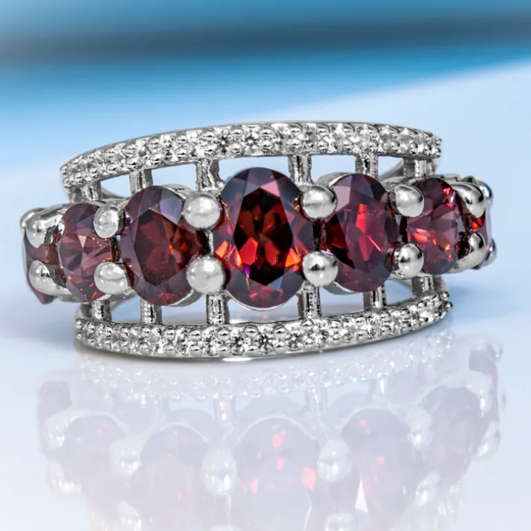 Lassen Sie sich von diesem bezaubernden Ring verzaubern, der eine prächtige Ansammlung von rosa Zirkonen aus Kambodscha mit insgesamt 5,44 Karat aufweist. Die ovalen und runden Zirkone ergänzen perfekt das glänzende Band aus platiniertem 925er Sterlingsilber, das etwa 5,81 Gramm wiegt. Mit seinem modernen Design strahlt der Ring Eleganz aus und ist die ideale Wahl für festliche Anlässe oder als schicke Ergänzung im Alltag. Die filigrane Anordnung der Edelsteine macht ihn zu einem Blickfang, der Bewunderung verspricht.