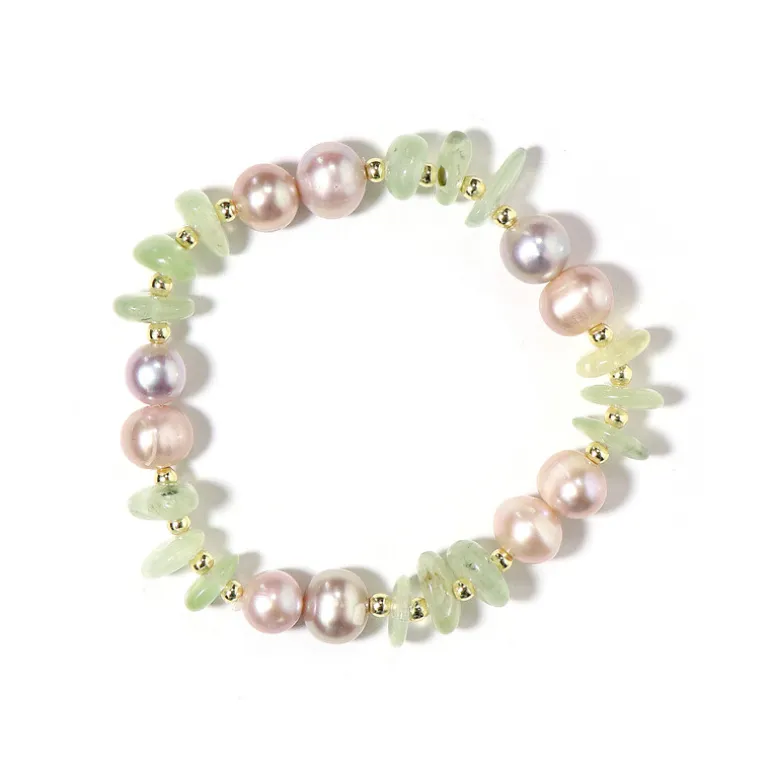 Entdecken Sie die Harmonie der zarten Farbtöne mit diesem Prehnit-Armband. Dieses Accessoire aus australischem Prehnit, gepaart mit pfirsichfarbenen Süßwasserperlen aus China und goldenen Hämatitperlen aus den USA, hat ein Gesamtgewicht von 48,102 ct. Dieses vielseitige Armband eignet sich perfekt, um sowohl der Freizeit- als auch der Abendgarderobe einen Hauch von Eleganz zu verleihen, und ist somit die ideale Wahl für jeden Anlass.