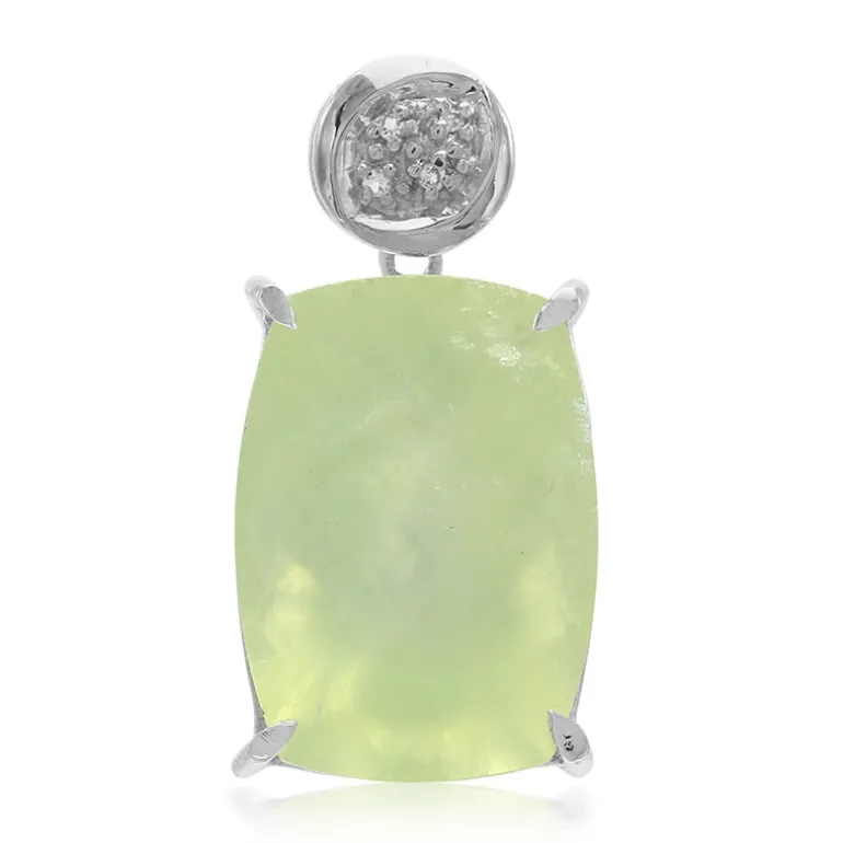 Entdecken Sie den ätherischen Charme dieses Anhängers mit einem australischen Prehnit von 14,36 Karat im einzigartigen antiken Schachbrettschliff. Der Hauptstein wird von einem Quartett aus brasilianischen Weißtopasen ergänzt, die dem Design einen Hauch von Brillanz verleihen. Eingefasst in hochwertiges 925er Sterling Silber, ist dieses Schmuckstück nicht nur ein Schmuckstück, sondern ein Kunstwerk. Kombinieren Sie ihn mit einer pastellfarbenen Bluse für den Tag oder einem fließenden Kleid für eine Abendveranstaltung. Sein zarter Grünton verspricht Vielseitigkeit und Eleganz für jede Garderobe.