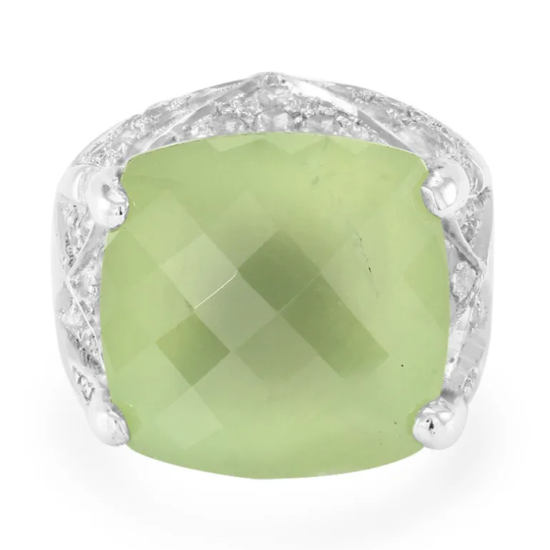 Entdecken Sie den lebendigen Charme unseres australischen Prehnit-Rings, gekrönt von einem 16 mm großen antiken Kissen im Schachbrettschliff, der Anmut verkörpert. Dieses exquisite Stück umschließt einen 15,99 Karat schweren Prehnit in 925er Sterlingsilber, der von einer Reihe brillanter weißer Topase von insgesamt 1,341 Karat akzentuiert wird, die um den zentralen Edelstein tanzen. Das verschlungene Silberband mit einem Gewicht von ca. 8,51 Gramm weist weitere Topasverzierungen auf, die zum Gesamtkaratgewicht des Rings von 17,996 ct. beitragen. Er ist ein Gesprächsanlass bei Zusammenkünften und passt perfekt zu Erdtönen für einen geerdeten und doch raffinierten Look.