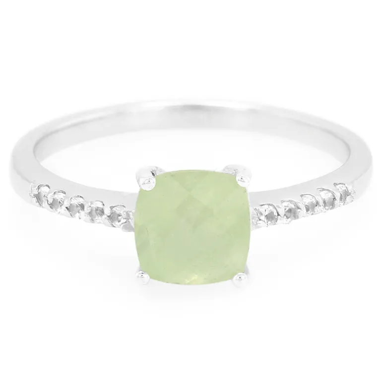 Entdecken Sie die Eleganz dieses Rings aus 925er Sterlingsilber, der mit einem australischen Prehnit im Kissenschliff von 0,79 Karat besticht, der für seine sanften Grüntöne bekannt ist. Umgeben von zehn weißen Topasen aus Brasilien, die den Hauptstein zum Funkeln bringen. Dieser Ring eignet sich sowohl für die Freizeit als auch für formelle Anlässe und ist eine vielseitige Ergänzung für jede Schmucksammlung.