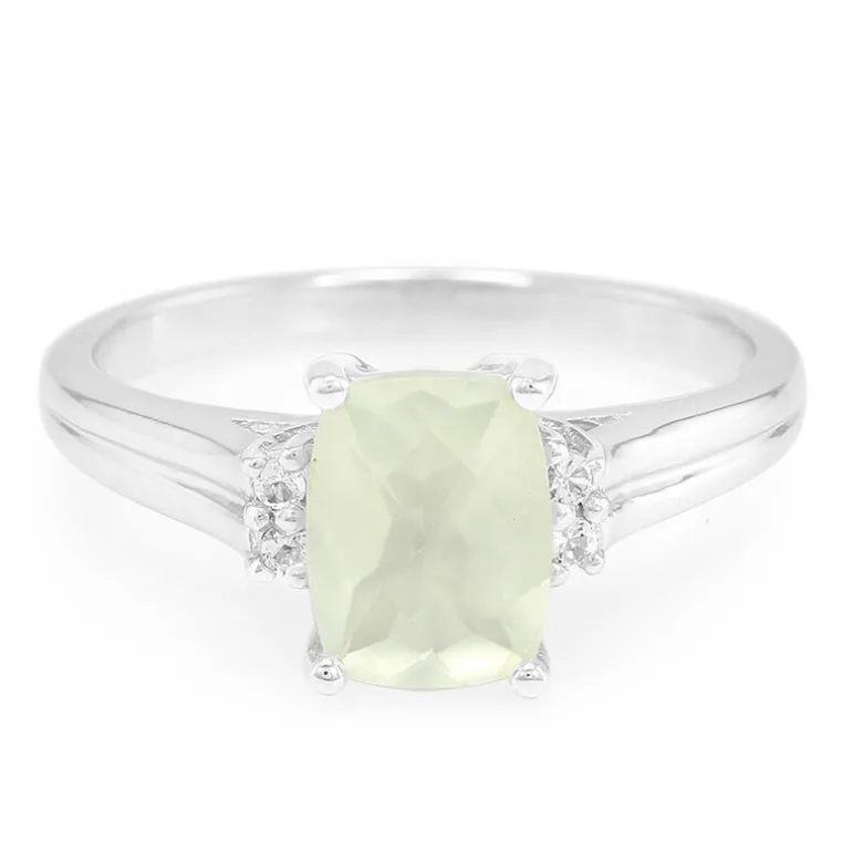 Entdecken Sie die Anziehungskraft dieses bezaubernden Rings aus australischem Prehnit, gekrönt von funkelnden weißen Topas-Akzenten. Der Ring ist aus hochwertigem 925er Sterlingsilber gefertigt und mit einem 1,1 Karat schweren Prehnit-Edelstein im eleganten antiken Schachbrettschliff besetzt. Die vier runden Brillanttopase aus Brasilien sorgen für zusätzlichen Glanz und bringen das Gesamtkaratgewicht auf 1,146 ct. Mit seinen Maßen von 25 x 20 mm ist er ein Schmuckstück, das sowohl im Alltag als auch bei besonderen Anlässen eine gute Figur macht. Sein sanfter grüner Farbton und sein klassisches Design machen ihn zu einem vielseitigen Accessoire, das sowohl für den Alltag als auch für den Abend geeignet ist.