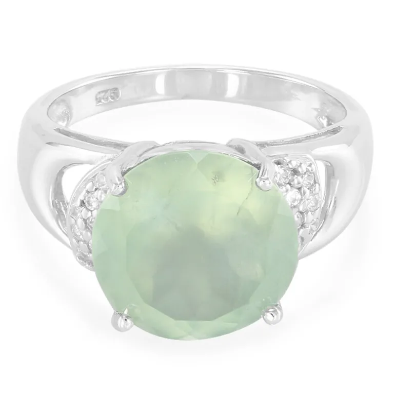 Dieser raffinierte Ring aus hochwertigem 925er Sterlingsilber präsentiert einen bezaubernden australischen Prehnit von 4,83 Karat im Rundschliff, der durch funkelnde Zirkon-Akzente aus Kambodscha von insgesamt 0,129 Karat ergänzt wird. Die Kombination aus den sanften Grüntönen des Prehnits und dem brillanten Glanz des feinen Zirkons und des Silbers ist ein perfektes Accessoire sowohl für die Freizeit als auch für formelle Anlässe. Dieses Schmuckstück ist ideal für alle, die sich zu einzigartigen Edelsteinen hingezogen fühlen und verspricht, eine wertvolle Ergänzung für jede Sammlung zu werden.
