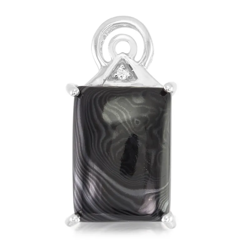 Entdecken Sie die Eleganz unseres faszinierenden Anhängers mit einem 16,64 ct großen Baguette-Cabochon aus Psilomelan, der im Herzen der USA abgebaut wird. Dieser rätselhafte Edelstein ist berühmt für seine auffälligen, wellenförmigen Muster und seine tiefen, fesselnden Farbtöne. Im Kontrast zu einem funkelnden brasilianischen Weißtopas strahlt dieses Schmuckstück Raffinesse aus. Er ist fachmännisch in 925er Sterlingsilber gefasst und liegt mit seinen 2,54 g anmutig an Ihrem Dekolleté. Er ist eine tadellose Wahl für die Abendgarderobe und verleiht jedem Ensemble einen Hauch von Faszination.