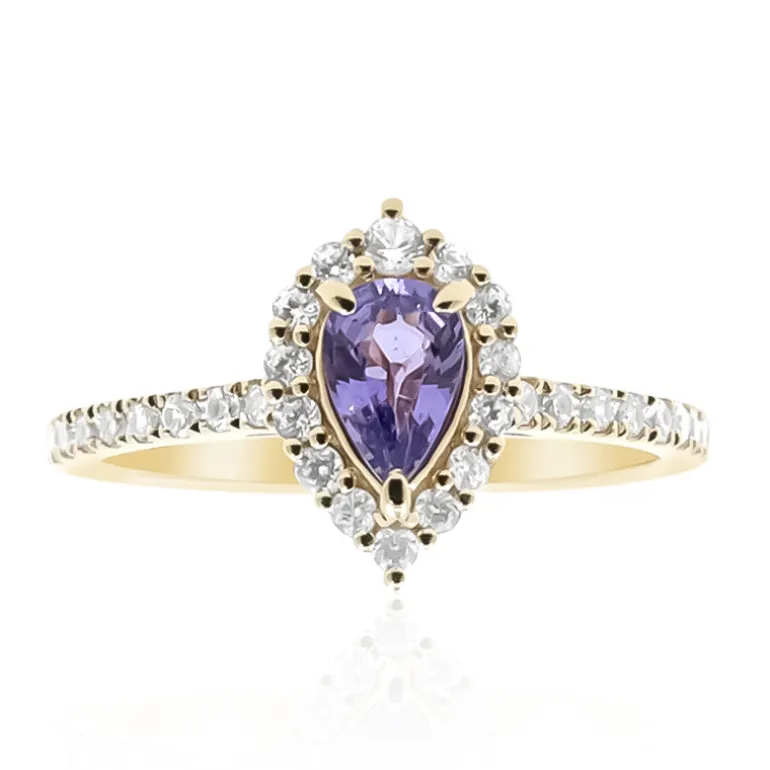 Erleben Sie die Anziehungskraft dieses bezaubernden Rings aus Ceylon Purple Sapphire in einer Fassung aus glänzendem 9-karätigem Gelbgold mit einem Gewicht von etwa 1,84 g. Der zentrale Edelstein, der aus Sri Lanka stammt, ist ein eleganter Tropfen von 0,405 Karat. Er wird von einem Halo aus funkelnden Zirkonen aus Kambodscha mit einem Gesamtgewicht von 0,399 ct umrahmt, die das Funkeln des Rings noch verstärken. Mit seinen Maßen von 23,5 x 20 mm ist dieses Schmuckstück ein Ausdruck von Luxus und Exklusivität. Perfekt für Abendveranstaltungen oder als raffinierte Ergänzung zu Ihrer täglichen Kleidung, verspricht er, Bewunderung zu erregen und jede Kleidung aufzuwerten.