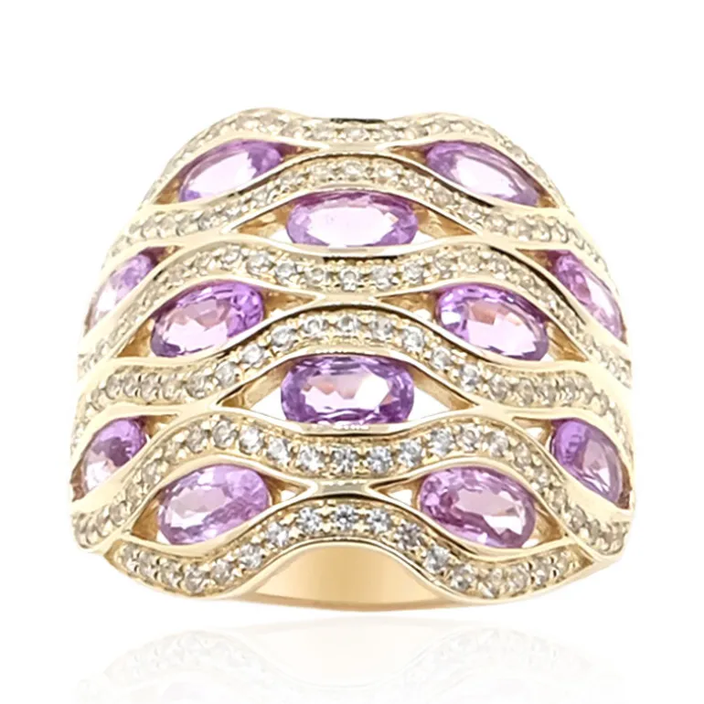 Entdecken Sie die lebendige Anziehungskraft dieses Rings aus 9 Karat Gelbgold, der eine Fülle von violetten Ceylon-Saphiren zeigt, die wunderschön in einem ovalen Schliff angeordnet sind. Mit einer Größe von 24 x 23 mm bietet er eine Symphonie von 12 Saphiren aus Sri Lanka mit einem Gesamtgewicht von 3,024 ct, die durch 134 funkelnde Zirkone aus Kambodscha mit einem Gesamtgewicht von 0,844 ct ergänzt werden. Er ist ideal, um sowohl formellen als auch alltäglichen Anlässen einen Hauch von Eleganz zu verleihen.