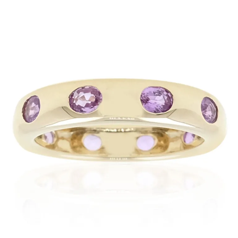 Entdecken Sie die zeitlose Eleganz dieses Rings aus 14-karätigem Gelbgold, der ein Quartett aus atemberaubenden violetten Ceylon-Saphiren von insgesamt etwa 2 Karat präsentiert. Die mit Präzision gefertigten Saphire sind entlang der Oberfläche des Rings in eine Lünette gefasst, die eine elegante und raffinierte Silhouette schafft. Dieses Schmuckstück ist eine fabelhafte Wahl für alle, die einen Farbakzent mit klassischem Charakter suchen. Es lässt sich mühelos vom Tag zum Abend tragen und passt sowohl zu Businesskleidung als auch zu Abendkleidern und verleiht ihnen einen Hauch von raffiniertem Glamour.