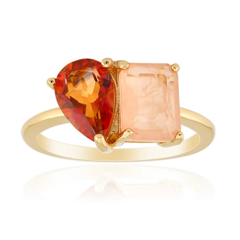Dieser exquisite Ring zeigt eine atemberaubende Kombination aus orangefarbenem mystischem Quarz und pfirsichfarbenem Pastellquarz aus Brasilien. Der Ring aus vergoldetem 925er Sterlingsilber hat einen Birnen- und einen Achteckschliff mit insgesamt 2,223 ct. Er ist sowohl für den Abend als auch für den Tag geeignet und lässt sich sowohl mit legeren als auch mit formellen Outfits kombinieren. Ein echtes Statement für jede Schmucksammlung.