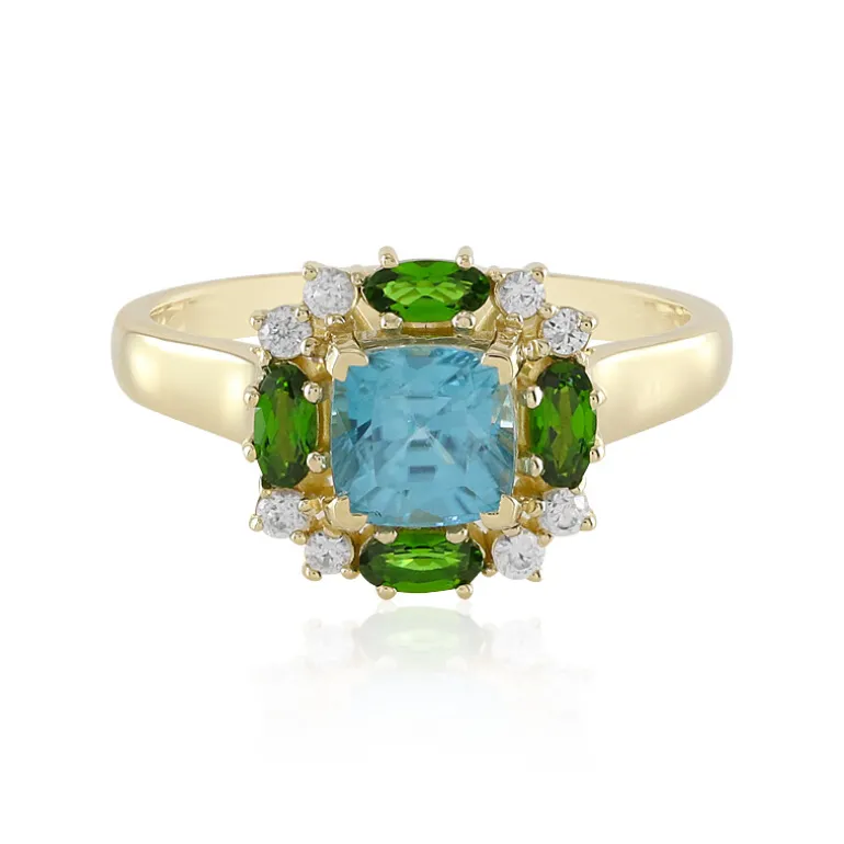 Tauchen Sie ein in die leuchtenden Blau- und Grüntöne dieses Rings aus 9 Karat Gelbgold mit einem prächtigen 1,96-karätigen Ratanakiri-Zirkon aus Kambodscha mit antikem Kissenglanz. Umgeben von üppigen russischen Diopsid-Akzenten und funkelnden kambodschanischen Zirkonen, strahlt dieser Ring mit einem Gesamtgewicht von 2,50ct Eleganz aus. Zeigen Sie seinen klassischen Charme bei jeder Soirée oder verleihen Sie Ihrem Alltagsstil einen Hauch von Luxus.