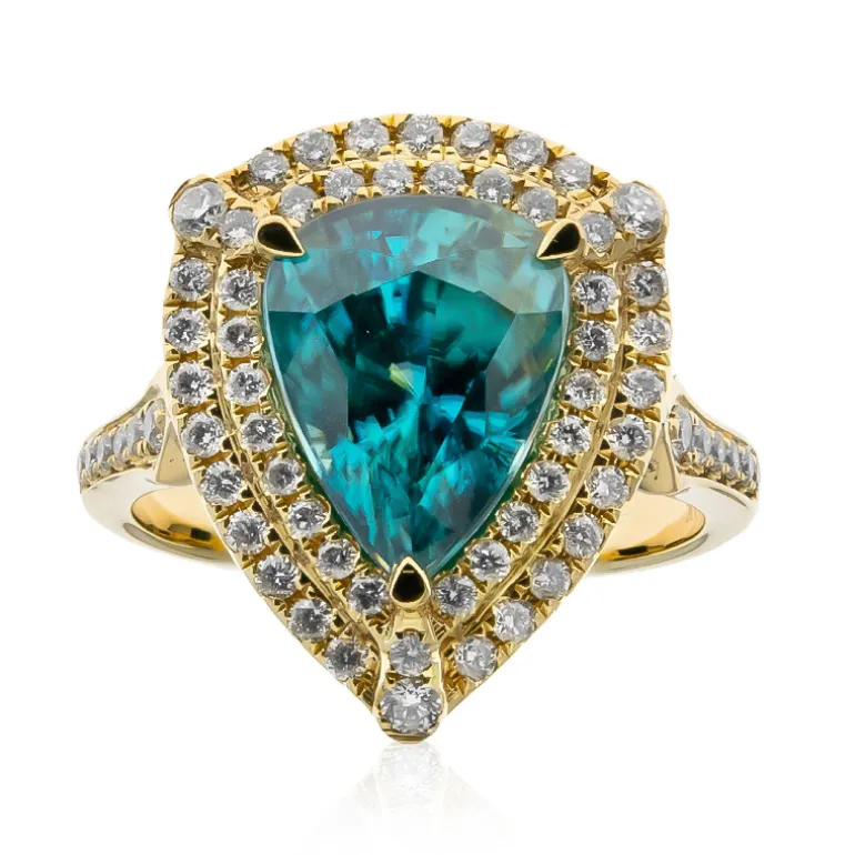 Entdecken Sie die fesselnde Anziehungskraft dieses Zirkonrings aus Ratanakiri, der wunderschön in 14 Karat Gelbgold gefasst ist. Der 7,04 Karat schwere, tränenförmige Zirkon aus Kambodscha wird von 65 SI2-Diamanten eingerahmt, die ihm einen Hauch von Glanz und Eleganz verleihen. Dieses atemberaubende Schmuckstück eignet sich perfekt für formelle Anlässe und wertet jedes Outfit auf – ideal für Gala-Events oder romantische Abende. Sein luxuriöses Design verspricht, einen bleibenden Eindruck zu hinterlassen.