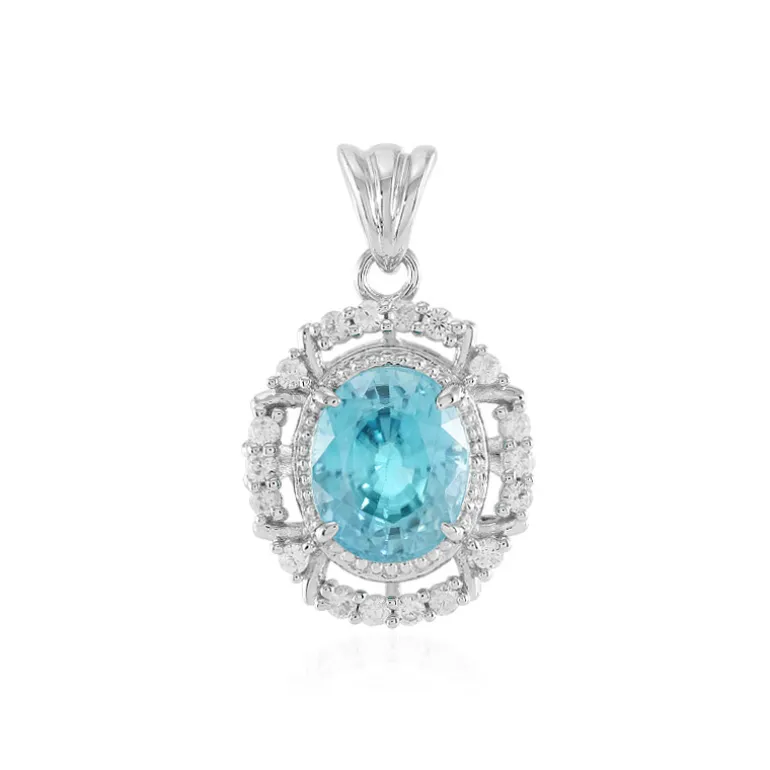 Dieser bezaubernde Anhänger hebt einen atemberaubenden 4,03ct ovalen Zirkon im Brillantschliff aus Kambodscha hervor, der für sein außergewöhnliches Funkeln und seinen ruhigen blauen Farbton bekannt ist. Umgeben von 18 glitzernden Zirkonen im Rundschliff mit einem Gesamtgewicht von 0,47 Karat, bringt die Fassung aus 925er Sterlingsilber, die elegant platiniert ist, den zentralen Edelstein wunderbar zur Geltung. Mit einem ungefähren Metallgewicht von 2,14 g und einem Gesamtkaratgewicht von 4,509 ct ist dieser Anhänger sowohl eine exquisite als auch eine substanzielle Ergänzung für jede Sammlung. Er ist ideal für die Abendgarderobe oder besondere Anlässe und verleiht jedem Outfit einen Hauch von Raffinesse.