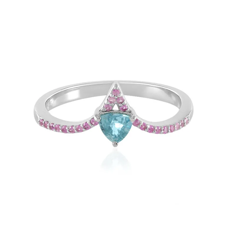 Dieser bezaubernde Ring zeigt einen auffälligen Ratanakiri-Zirkon im Trillant-Schliff von 0,651 Karat aus Kambodscha, der in der Mitte eines modernen, geteilten Rings gefasst ist. Der blaue Edelstein wird von 23 rosafarbenen Ceylon-Saphiren im Rundschliff von insgesamt 0,201 ct aus Sri Lanka umgeben. Die kontrastierenden Farben erzeugen einen fesselnden Effekt vor dem Hintergrund des platinierten 925er Sterling Silbers mit einem Gewicht von ca. 2,17 g. Dieser Ring ist ideal, um einen farblichen Akzent zu setzen, und eignet sich sowohl für legere als auch für formelle Anlässe. Er ergänzt Ihre Garderobe mit seinen leuchtenden Farben und seinem eleganten Design.