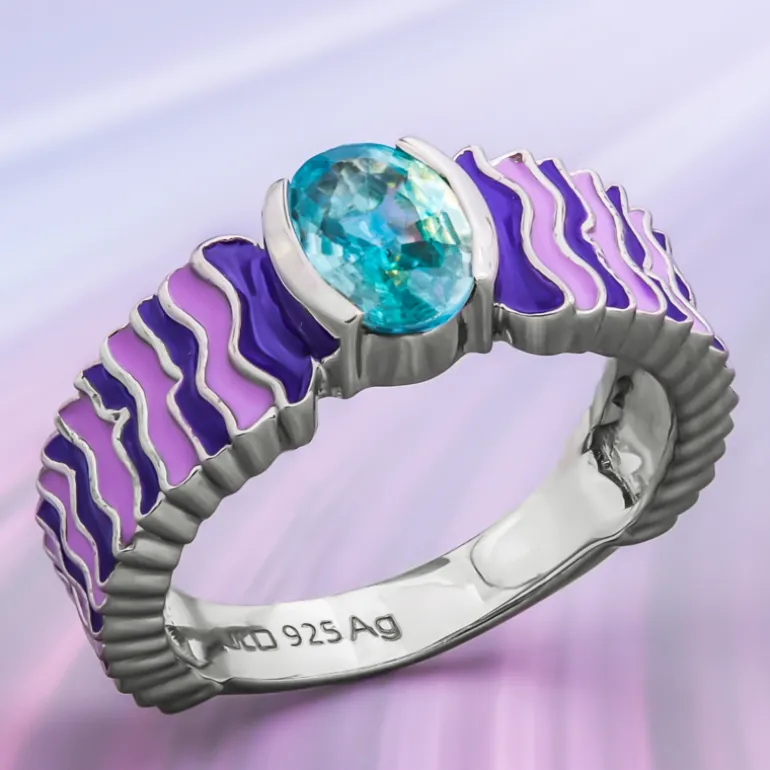 Verführen Sie Ihre Sinne mit diesem strahlenden Ratanakiri-Zirkonring, der aus den mineralreichen Böden Kambodschas stammt. In der Mitte dieses Schmuckstücks befindet sich ein ovaler Stein von 1,02 Karat. Der kühle blaue Farbton wird durch den schimmernden Glanz des platinierten 925er Sterlingsilbers ergänzt. Die wellenförmigen lilafarbenen, emaillierten Akzente sorgen für ein harmonisches Farbspiel, das sowohl im Alltag als auch bei besonderen Anlässen für einen Hauch von Eleganz sorgt. Kombinieren Sie ihn mit pastellfarbenen oder neutralen Ensembles für einen raffinierten Look, der die Zeit überdauert.