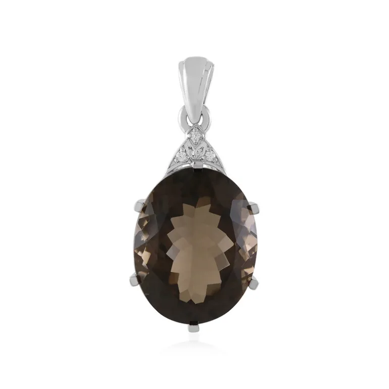 Dieser exquisite Anhänger besteht aus einem atemberaubenden 26,617-karätigen Rauchquarz aus Brasilien, der meisterhaft in eine ovale Form geschliffen wurde. Akzentuiert mit drei funkelnden Zirkonen aus Tansania, ist der Anhänger in platiniertes 925er Sterlingsilber gefasst und verleiht ihm einen Hauch von Eleganz. Dieses Schmuckstück eignet sich sowohl für legere als auch für formelle Anlässe und passt hervorragend zu einem klassischen schwarzen Kleid oder einer schicken Abendgarderobe und verleiht jedem Outfit Raffinesse.