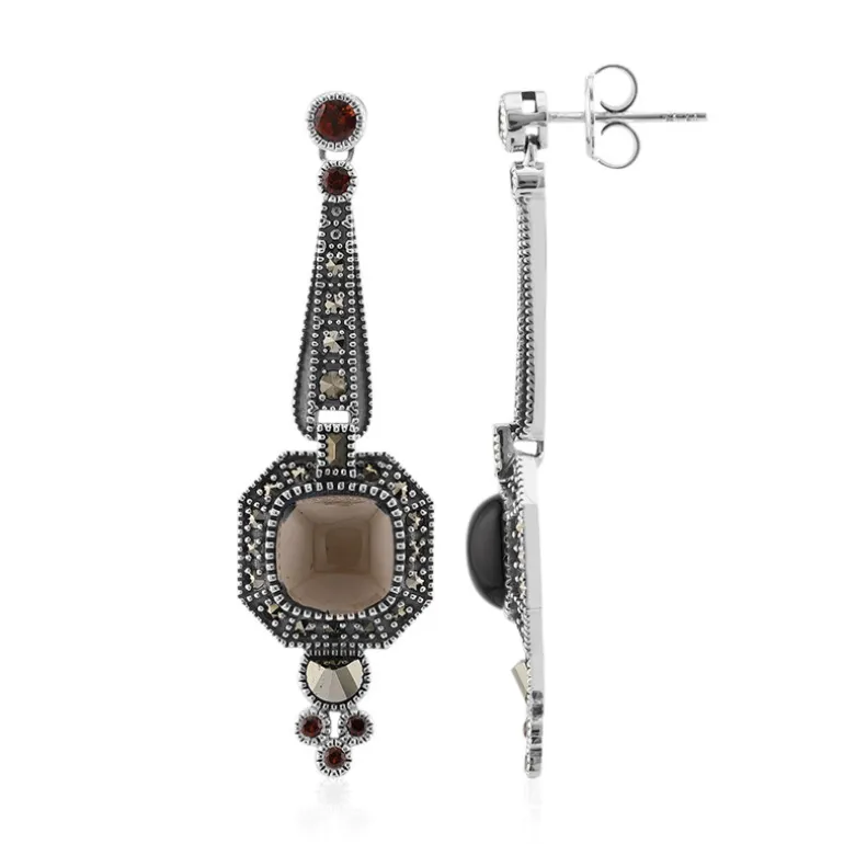 Zeitlose Eleganz mit diesen exquisiten Ohrringen mit Rauchquarz aus Madagaskar, akzentuiert durch leuchtende Granate aus Mosambik und funkelnde österreichische Markasite. Die aus Sterlingsilber gefertigten 48 mm großen Ohrringe sind eine raffinierte Ergänzung für jedes Outfit. Sie sind ideal für Abende oder besondere Anlässe und ihr antikes Kissen-Cabochon-Design verleiht ihnen einen Hauch von Vintage-Allüre.