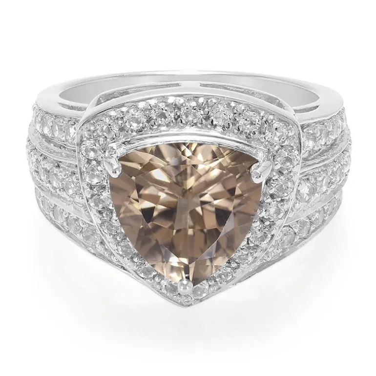 Entdecken Sie die Eleganz dieses atemberaubenden Rings mit einem brasilianischen Rauchquarz im Trillantschliff von 2,57 Karat, der von 59 weißen Topasen umrahmt wird. Das filigrane Design aus 925er Sterlingsilber verleiht jedem Outfit einen Hauch von Raffinesse. Perfekt für abendliche Soireen oder als glamouröser Begleiter für den Alltag. Mit seinem einzigartigen Charme unterstreicht er mühelos Ihren Stil.