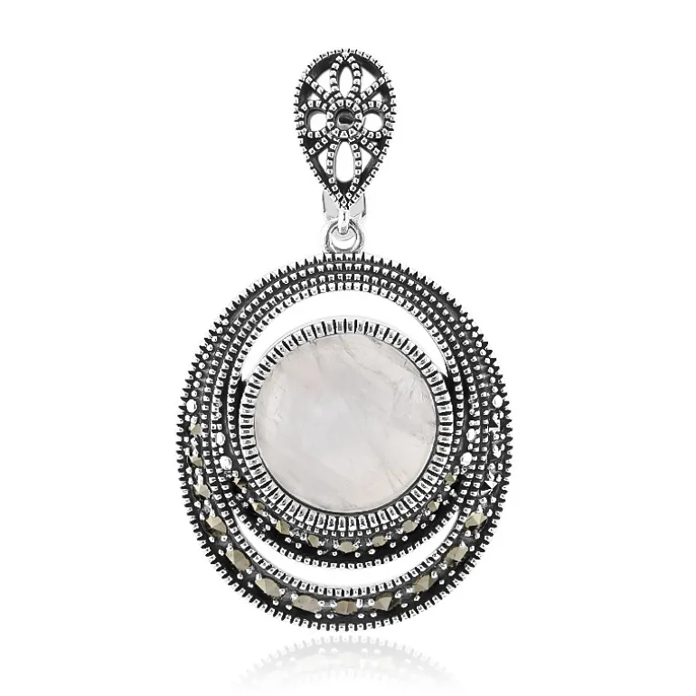 Dieser bezaubernde Anhänger aus 925er Sterlingsilber umschließt einen atemberaubenden 5,2-karätigen Regenbogenmondstein aus Sri Lanka, der von einem zarten Heiligenschein aus österreichischem Marcasit umgeben ist. Die geschichteten Kreise aus glitzerndem 0,49-karätigem Marcasit verleihen dem bezaubernden undurchsichtigen Glanz des zentralen Edelsteins Tiefe und Kontrast. Mit seinen großzügigen Maßen von 39×22 mm ist er das ideale Accessoire für einen auffälligen Auftritt. Kombinieren Sie ihn mit einem eleganten Abendkleid oder einer raffinierten Bluse, um Ihren Look für jeden besonderen Anlass aufzuwerten.