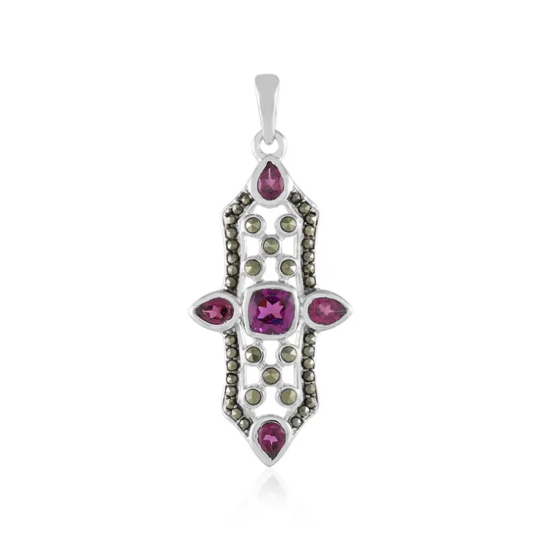Dieser exquisite Anhänger zeigt brasilianische Rhodolite im antiken Kissen- und Tropfenschliff, die durch österreichische Markasit-Akzente veredelt werden. Er ist aus 925er Sterlingsilber gefertigt, wiegt 2,66 g und hat ein Gesamtgewicht von 1,944 ct. Er ist perfekt, um die Abendgarderobe aufzuwerten oder der Alltagskleidung einen Hauch von Eleganz zu verleihen. Er ist ideal für besondere Anlässe und passt hervorragend zu Outfits in tiefen Farbtönen.