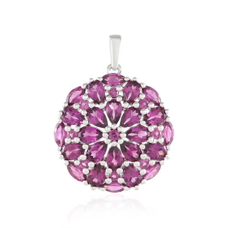 Dieser atemberaubende Anhänger zeigt ein kompliziertes Blumendesign mit 33 schillernden Rhodolithen von insgesamt 5,262 Karat. Jeder Edelstein ist meisterhaft in Tropfen-, Marquise- und runde Formen geschliffen und in glänzendes platiniertes 925er Sterlingsilber gefasst. Er eignet sich perfekt für besondere Anlässe oder für den eleganten Alltag und lässt sich wunderbar mit Abendkleidern oder schicker Bürokleidung kombinieren, um ein unvergessliches Statement abzugeben.