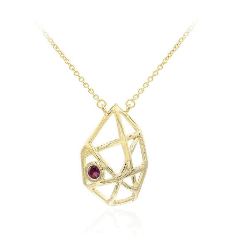 Entdecken Sie die geometrische Anziehungskraft dieses atemberaubenden Anhängers mit einem brasilianischen Rhodolithen von 0,126 Karat im fesselnden Rundschliff. Der lebendige violette Farbton des Edelsteins leuchtet vor dem glänzenden Hintergrund von 925er Sterlingsilber, das für einen zusätzlichen Hauch von Eleganz anmutig vergoldet ist. Mit einem Gesamtgewicht von ca. 2,81 g und den Abmessungen des Anhängers von 22 x 14 mm wird dieses Schmuckstück von einer 45,5 cm langen Kette getragen, die einen bequemen Sitz und eine raffinierte Ergänzung zu jedem Outfit verspricht. Dieser einzigartige Anhänger ist ideal für Abendveranstaltungen oder um Ihren Tageslook aufzuwerten. Er sorgt für Gesprächsstoff und verbindet modernes Design mit klassischer Schönheit.
