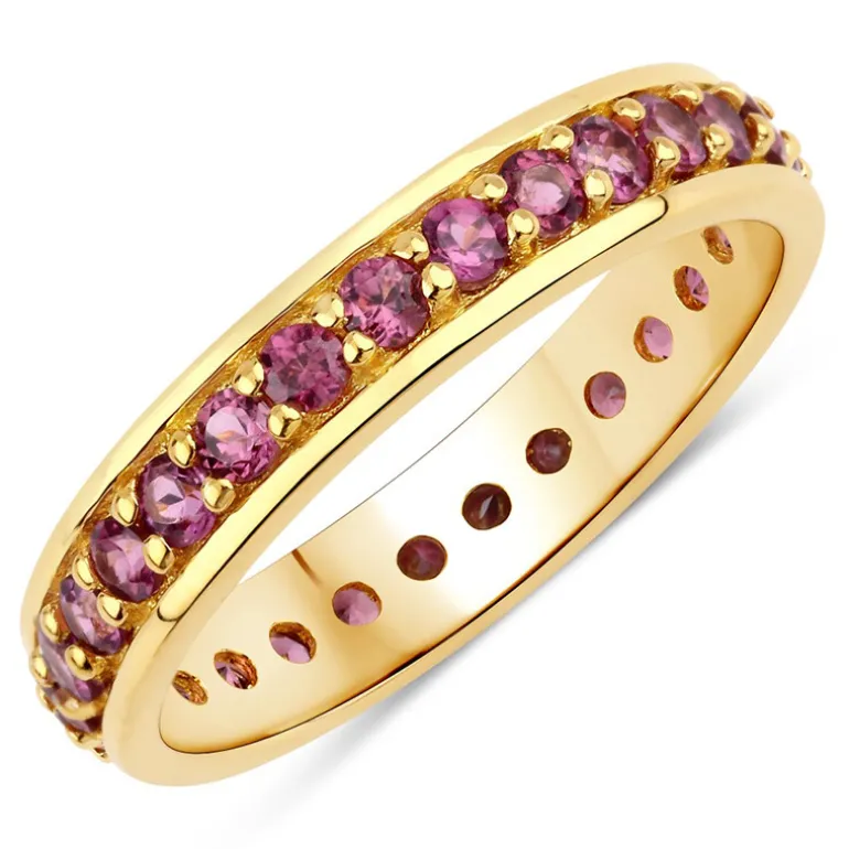 Dieser Ring ist eine atemberaubende Mischung aus moderner Raffinesse und klassischem Stil. Er ist mit einem ganzen Kreis aus strahlenden Rhodolith-Edelsteinen besetzt. In vergoldetem Silber gefasst, strahlt er einen satten, romantischen Farbton aus, der jedem Outfit einen Hauch von Eleganz verleiht. Er eignet sich sowohl für einen legeren Brunch als auch für eine elegante Abendveranstaltung und ist eine vielseitige Ergänzung Ihrer Schmucksammlung.