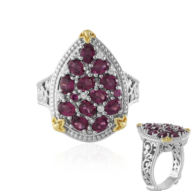 Entdecken Sie die bezaubernde Symphonie indischer Rhodolith-Edelsteine und funkelnder Zirkone mit diesem fesselnden Silberring. Platiniertes 925er Sterlingsilber umschließt eine atemberaubende Anordnung von Rhodolithen im Oval- und Rundschliff mit insgesamt 2,591 Karat, akzentuiert durch einen subtilen Hauch tansanischer Zirkone für zusätzliche Finesse. Die großzügige Größe von 28 x 23 mm strahlt Präsenz und Eleganz aus und eignet sich perfekt für die Abendgarderobe oder als majestätischer violetter Akzent für die Tagesgarderobe. Dieser Ring ist für Sammler und Modefans gleichermaßen geeignet und verbindet exotischen Charme mit anspruchsvollem Design.