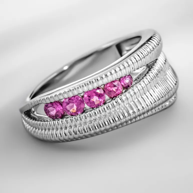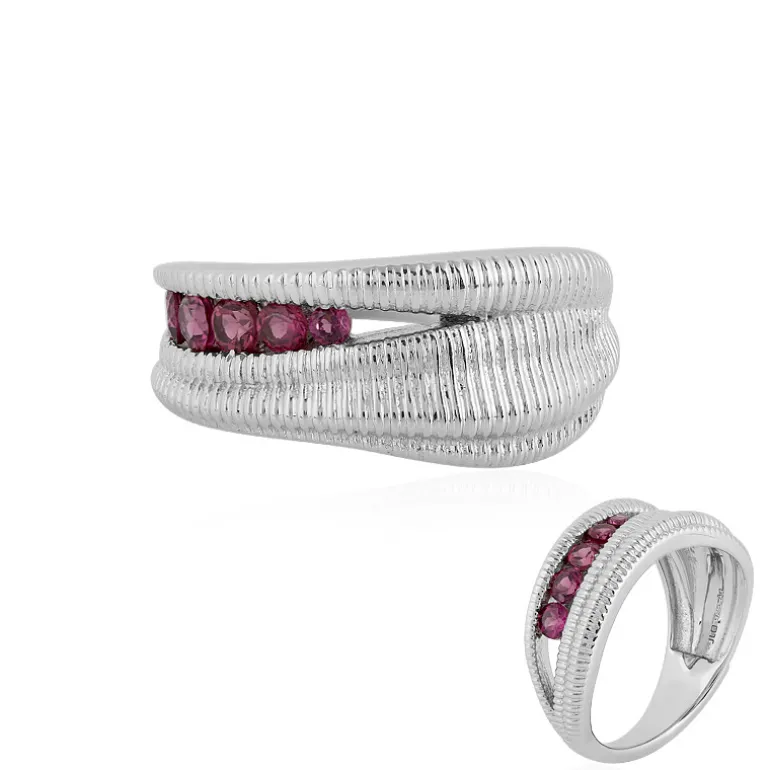 Entdecken Sie die Faszination des indischen Rhodoliths mit diesem schicken Ring aus platiniertem Sterlingsilber. Das Trio aus sorgfältig geschliffenen Edelsteinen mit insgesamt 0,582 Karat strahlt in einem subtilen und doch lebendigen Magenta-Farbton. Das moderne, gedrehte Design verleiht der klassischen Eleganz eine zeitgemäße Note und macht ihn zu einer vielseitigen Wahl sowohl für den Alltag als auch für besondere Anlässe. Seine einzigartige Textur und seine brillante Farbe machen ihn zum perfekten Gesprächsanlass bei jeder Veranstaltung.