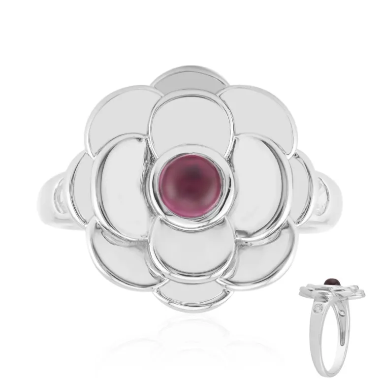 Entdecken Sie die Eleganz dieses exquisiten Rhodolith-Rings mit einem bezaubernden runden Cabochon-Edelstein aus Kenia. Der Ring aus Sterlingsilber wiegt 4,02 g und wird durch tansanische Zirkon-Akzente veredelt. Das florale Design verleiht ihm einen charmanten Touch und macht ihn perfekt für besondere Anlässe oder als raffinierten Begleiter für Ihren Alltagslook. Kombinieren Sie ihn mit einem anmutigen Abendkleid für zeitlose Eleganz.
