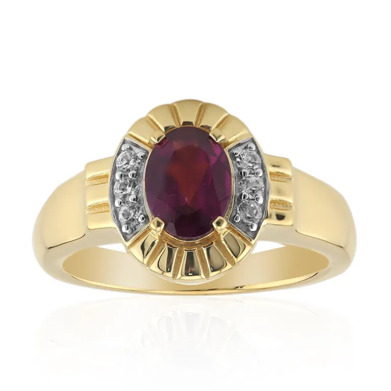 Entdecken Sie die Anziehungskraft des Rift Valley mit diesem schicken Ring aus vergoldetem 925er Sterlingsilber, der einen bezaubernden kenianischen Rhodolithen im Ovalschliff von 0,85 Karat enthält. Akzentuiert mit glitzernden Zirkonen aus Tansania hat dieser Ring ein Gesamtkaratgewicht von 0,968 ct. Sein fesselndes Design und sein warmer Goldton machen ihn zu einem vielseitigen Accessoire für den Alltag und besondere Anlässe. Kombinieren Sie diesen Ring mit Ihrem Lieblingskleid für einen raffinierten Touch oder mit einem Business-Anzug für einen Hauch von Eleganz.