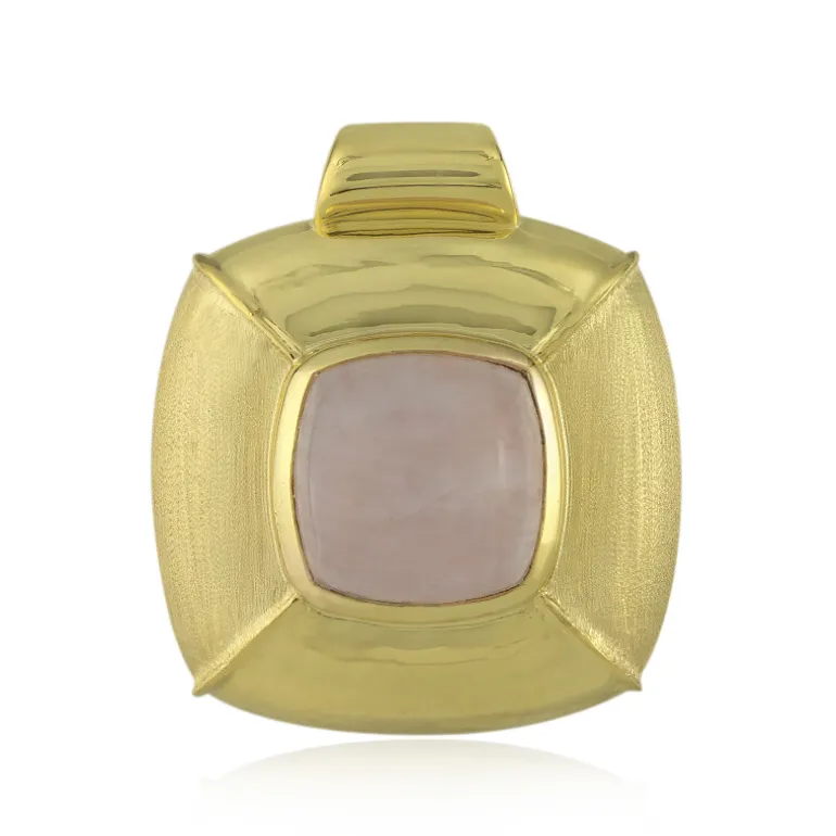 Entdecken Sie die fesselnde Anziehungskraft dieses vergoldeten Anhängers aus 925er Sterlingsilber aus der MONOSONO COLLECTION. Der luxuriöse brasilianische Rosenquarz von 10,41 Karat im antiken Kissen-Cabochon-Schliff verleiht diesem Schmuckstück einen warmen, sanften Glanz. Die beträchtliche Größe des Anhängers von 34×29 mm wird durch die Sanftheit des Rosenquarzes ausgeglichen, was ihn zu einem vielseitigen Accessoire macht, das sowohl tagsüber elegant als auch abends anmutig wirkt. Bringen Sie die Romantik des Rosenquarzes in Ihre Garderobe und verleihen Sie jedem Outfit einen Hauch von Raffinesse.