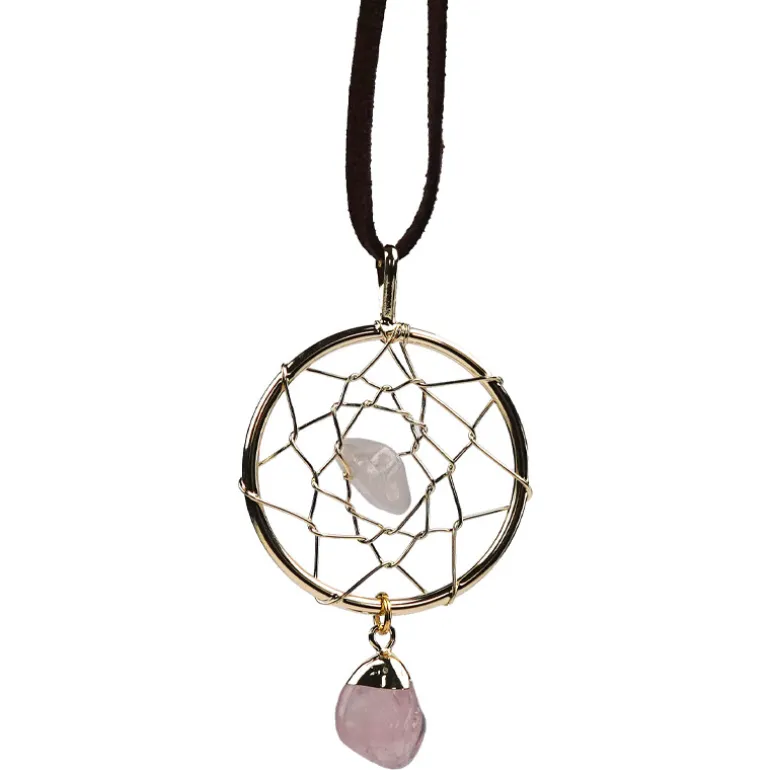 Entdecken Sie ein Symbol für heitere Eleganz mit unserem Madagaskar Rosenquarz Dreamcatcher Anhänger. Dieses bezaubernde Schmuckstück besteht aus einem 7,5-karätigen Rosenquarz im Fantasieschliff und einem zusätzlichen 0,4-karätigen Stein, der von der üppigen Insel Madagaskar stammt. Der Anhänger baumelt an einer plüschigen, braunen Kordel und hat ein Gesamtgewicht von 7,9 Karat. Das verschlungene Netzdesign ist aus Messing mit einer satten Goldauflage gefertigt und wiegt etwa 2,5 g. Mit den Maßen 64×35 mm und einer schicken 10 cm langen Kette verbindet dieser Anhänger traditionelle Traumfänger-Motive mit modernem Luxus. Dieser Anhänger ist ideal, um Ihrer Freizeitgarderobe einen Hauch von Skurrilität zu verleihen, oder als einzigartiges Geschenk, das für Gesprächsstoff sorgt.
