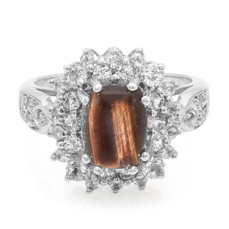 Dieser atemberaubende Ring zeigt die Anziehungskraft eines mexikanischen roten Tigerauges, dessen fesselnde Muster an den Blick einer wilden Katze erinnern. Umgeben von insgesamt 36 funkelnden weißen Topasen aus Brasilien sitzt dieser antike Edelstein im Cabochon-Schliff im Herzen einer Fassung aus 925er Sterlingsilber. Mit einem Gewicht von ca. 4,13 g beläuft sich das Gesamtgewicht der Edelsteine auf beachtliche 2,961 ct, was ihn zu einem bemerkenswerten Stück in jeder Sammlung macht. Er eignet sich perfekt zur Aufwertung von Abendgarderobe oder als exotischer Akzent für Ihr tägliches Ensemble und ist eine vielseitige Ergänzung Ihres Schmuckrepertoires.