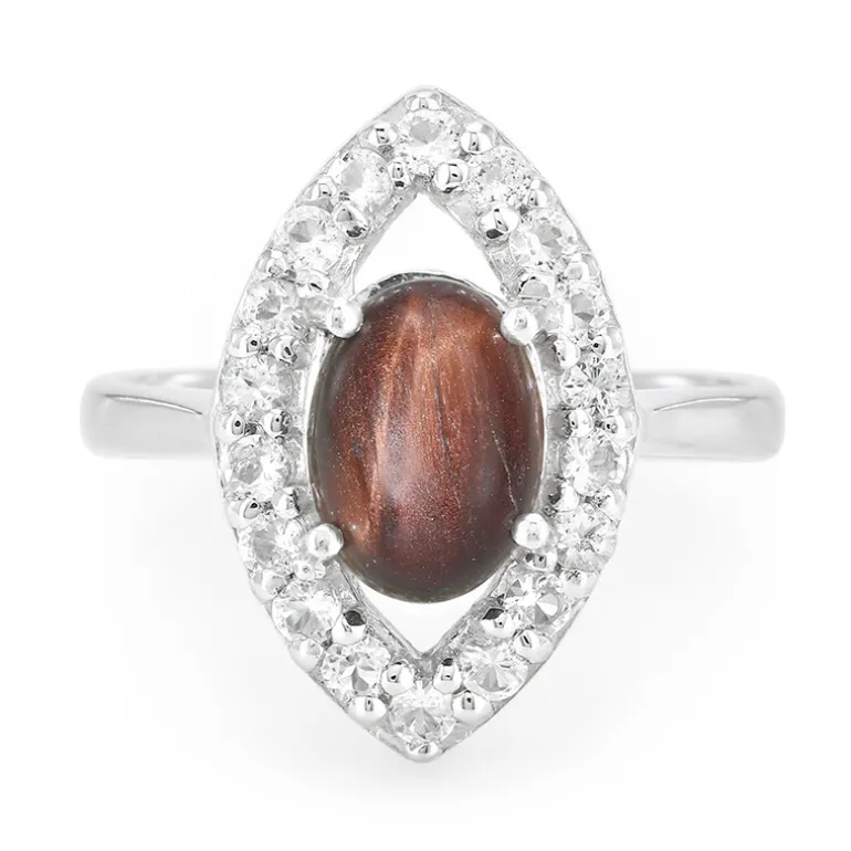 Entdecken Sie den fesselnden Charme dieses atemberaubenden Rings mit rotem Tigerauge, das aus dem Herzen Mexikos stammt. Der ovale Cabochon von 1,07 Karat ist in hochwertiges 925er Sterling Silber gefasst und wird von 0,51 Karat funkelnden weißen Topasen aus Brasilien flankiert, die in einem leuchtenden Design gefasst sind, das den Blick auf die warmen, erdigen Farbtöne des zentralen Steins lenkt. Dieser Ring mit einem Gewicht von ca. 2,62 Gramm strahlt eine schicke, vielseitige Eleganz aus, die sowohl zu Verlobungen am Tag als auch zu nächtlichen Veranstaltungen passt. Er ist eine wertvolle Ergänzung für jede Sammlung und lädt mit seiner einzigartigen Farbe und raffinierten Präsenz zu Komplimenten ein.