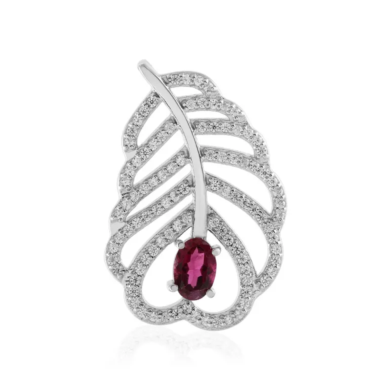 Hüllen Sie sich in die leuchtenden Farben der Natur mit diesem Madagaskar-Rubellit-Blattanhänger. Ein leuchtender Rubellit von 0,393 Karat im Ovalschliff befindet sich im Herzen eines Blattes aus Sterlingsilber, das für zusätzlichen Glanz und Haltbarkeit mit Platin überzogen ist. Umgeben von 98 Zirkonsteinen im Rundschliff mit insgesamt 0,664 Karat, fängt dieser elegante Anhänger die Essenz eines üppigen Paradieses ein. Kombinieren Sie ihn mit einem eleganten Abendkleid oder einer schicken Bluse für einen Hauch von Glamour. Sein botanisches Motiv macht ihn zu einem perfekten Accessoire für Frühlingsfeste oder zu einem durchdachten Geschenk, das Wachstum und Erneuerung symbolisiert.