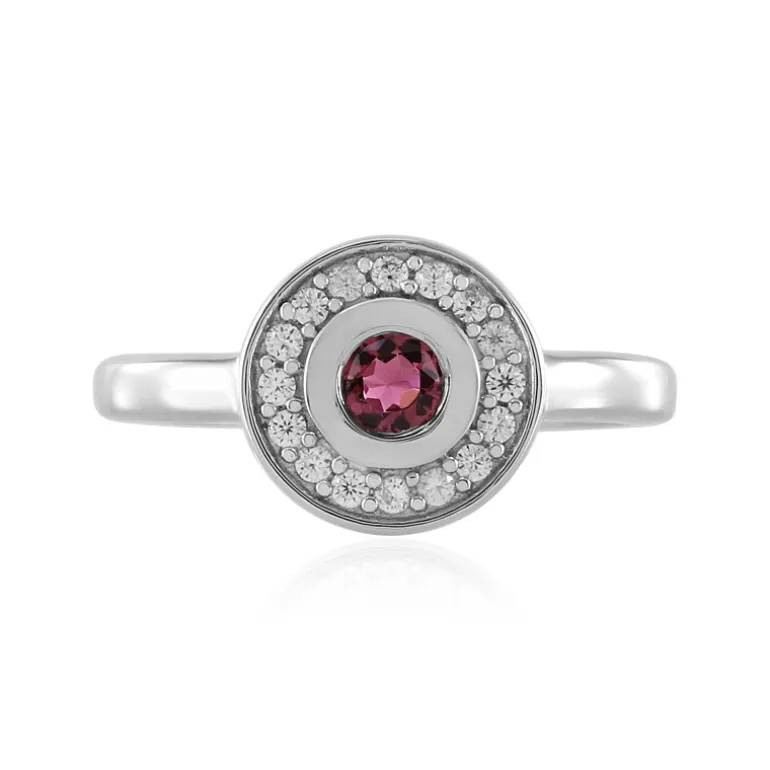 Entdecken Sie den Charme von Madagaskar mit diesem auffälligen Rubellit-Silberring. In der Mitte sitzt ein runder Edelstein im Brillantschliff von 0,143 Karat, der von funkelnden kambodschanischen Zirkonen von insgesamt 0,19 Karat umgeben ist und so einen schillernden Effekt erzeugt. Das Design dieses Rings aus 925er Sterlingsilber mit einer hochwertigen Platinveredelung für lang anhaltenden Glanz strahlt eine subtile Eleganz aus. Der rosafarbene Farbton des Edelsteins strahlt Wärme und Raffinesse aus und macht ihn zum idealen Accessoire sowohl für zwanglose Brunches als auch für abendliche Galas.