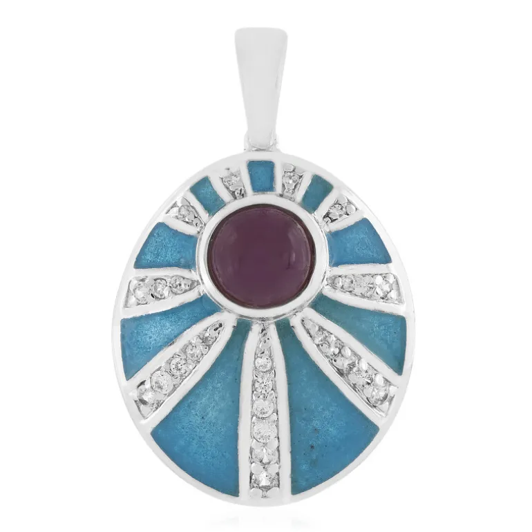 Dieser strahlende Anhänger präsentiert einen schimmernden indischen Rubin-Cabochon von 1,04 Karat, der von glitzernden kambodschanischen Zirkonen von insgesamt 0,27 Karat ergänzt wird, die alle in glattem 925er Sterlingsilber gefasst sind. Die an die Sonnenstrahlen erinnernde Emaillearbeit des Anhängers in einem leuchtenden Blauton schafft einen auffälligen Kontrast, der die Blicke auf sich zieht. Ob zu einer formellen Veranstaltung oder als eleganter Begleiter im Alltag – dieser Anhänger ist ein vielseitiger und geschätzter Bestandteil Ihrer Schmucksammlung.